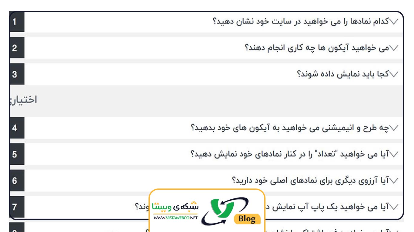 برای تنظیم آیکون ها فقط سه بخش اولی کافی هست و بقیه اختیاری هستن. شما خیلی راحت میتونید از بخش اول انتخاب کنید که چه آیکون هایی برای سایت نمایش داده بشن. در بخش دوم باید به آیکون ها لینک بدید و تعیین کنید که چه کاری انجام بدن.